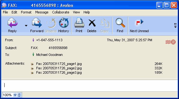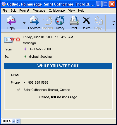 A voice message is received as a FirstClass message with a .wav file attachment. The first time you open the message, the attachment will play automatically.